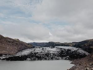 An inspiring close-up of Sólheimajökull Glacier’s rugged, icy surface, its dramatic crevasses and shimmering blue tones revealing nature’s raw power.